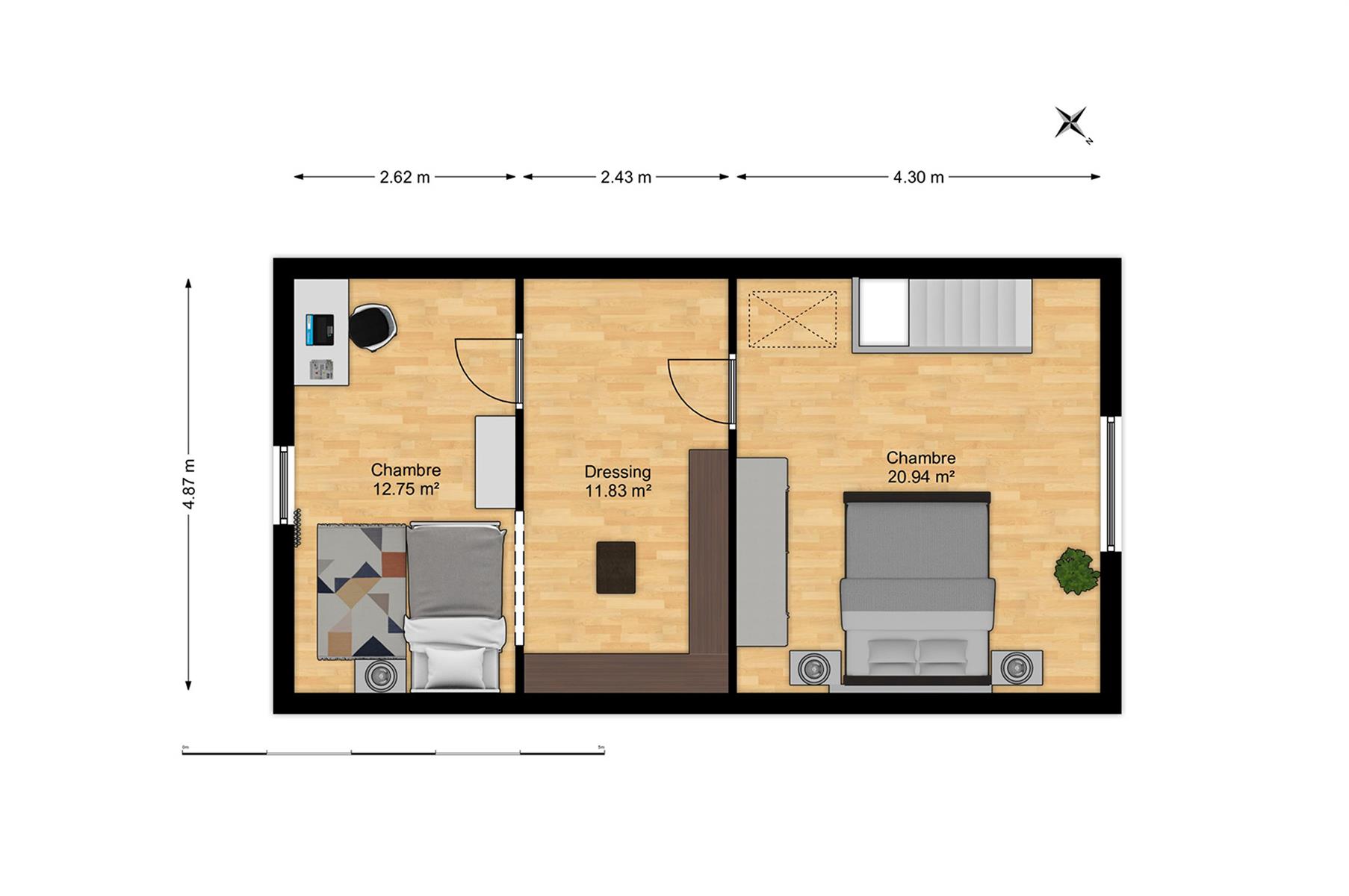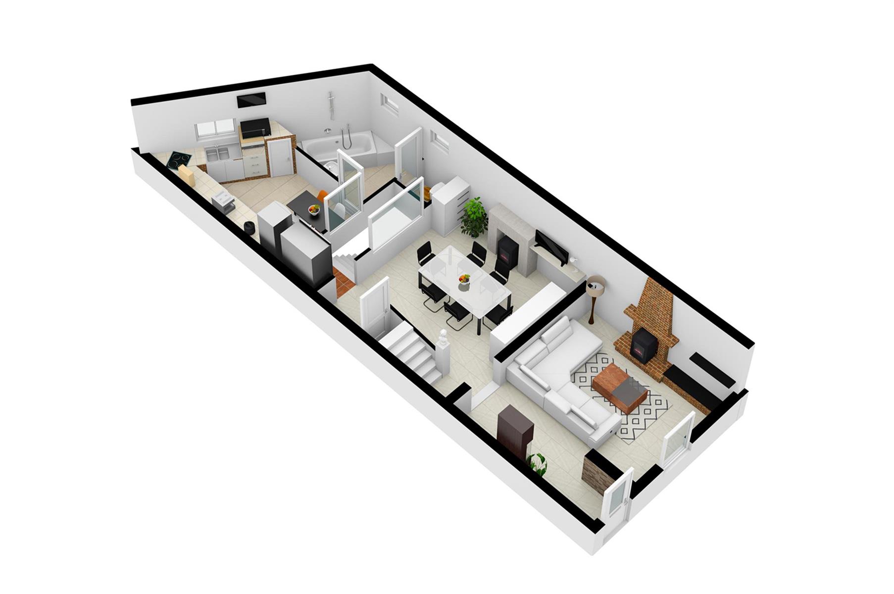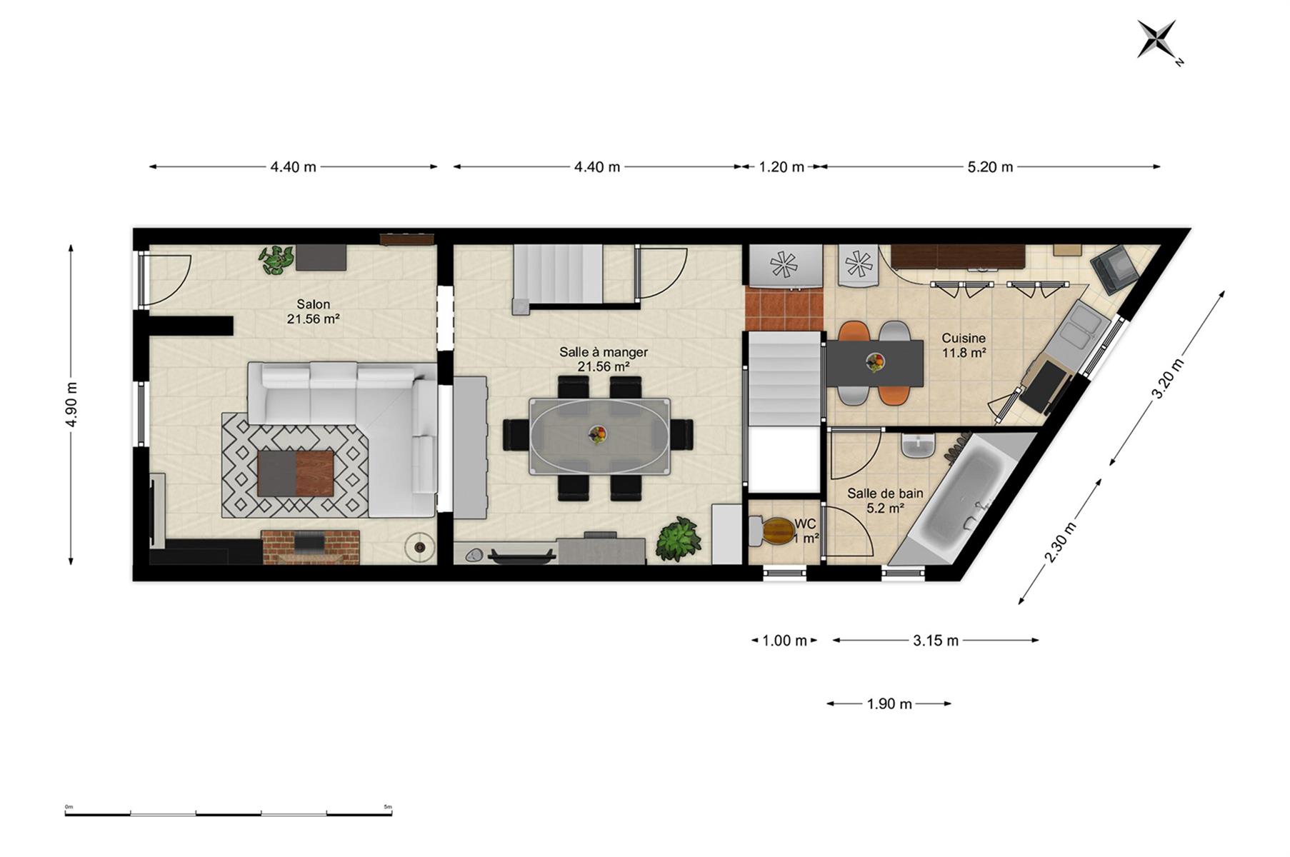 – Rez : salon, salle-à-manger, cuisine, salle de bains et wc séparé.