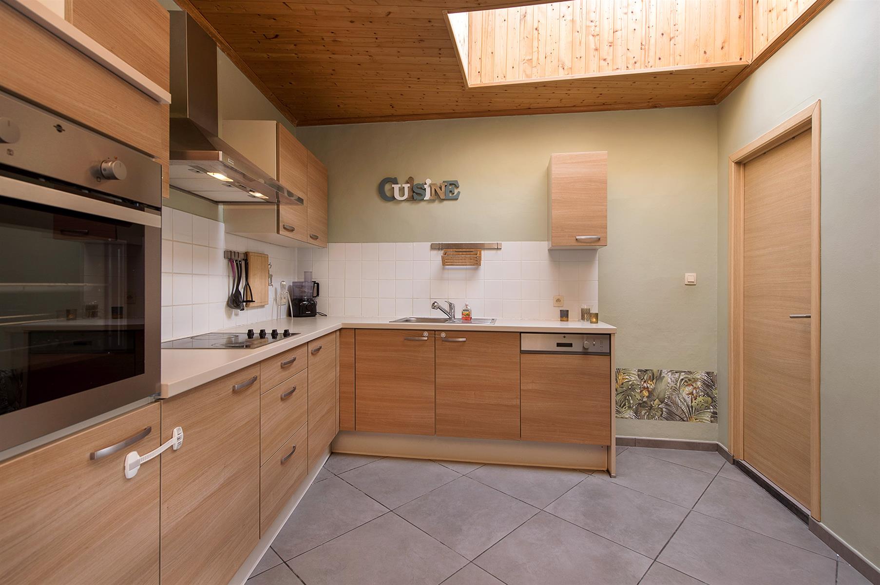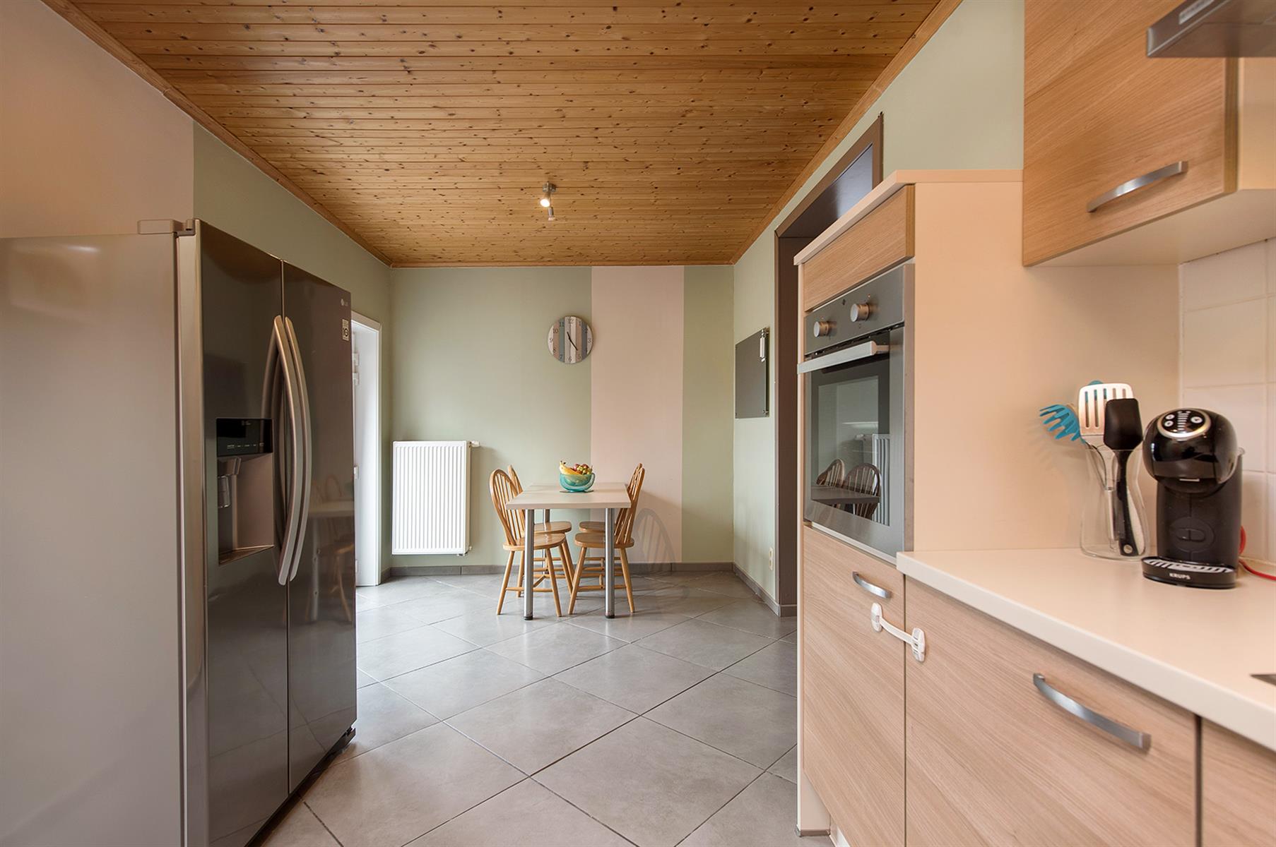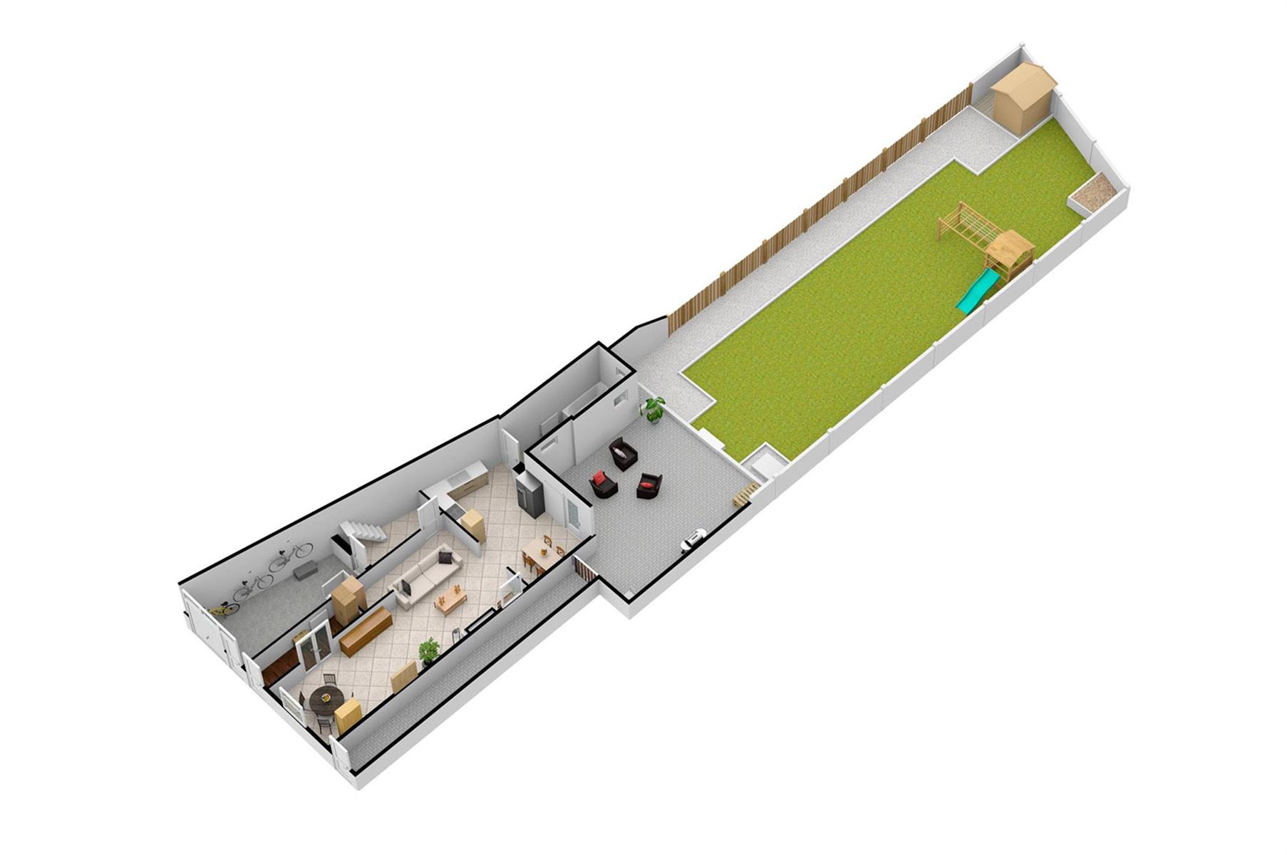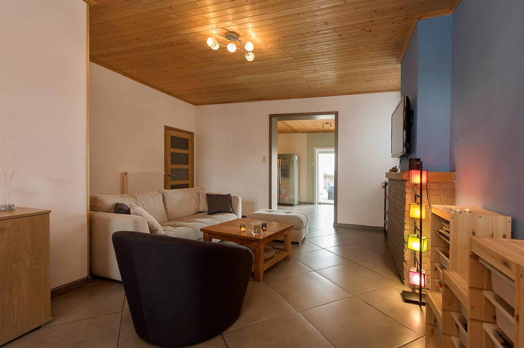 – Rez : hall d’entrée, séjour, cuisine, salle de bains, hall et petit garage de +/- 13,5m².