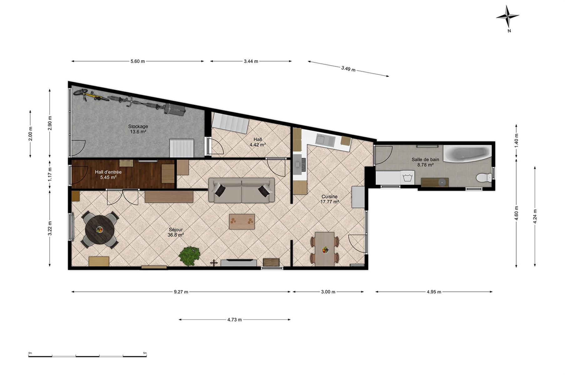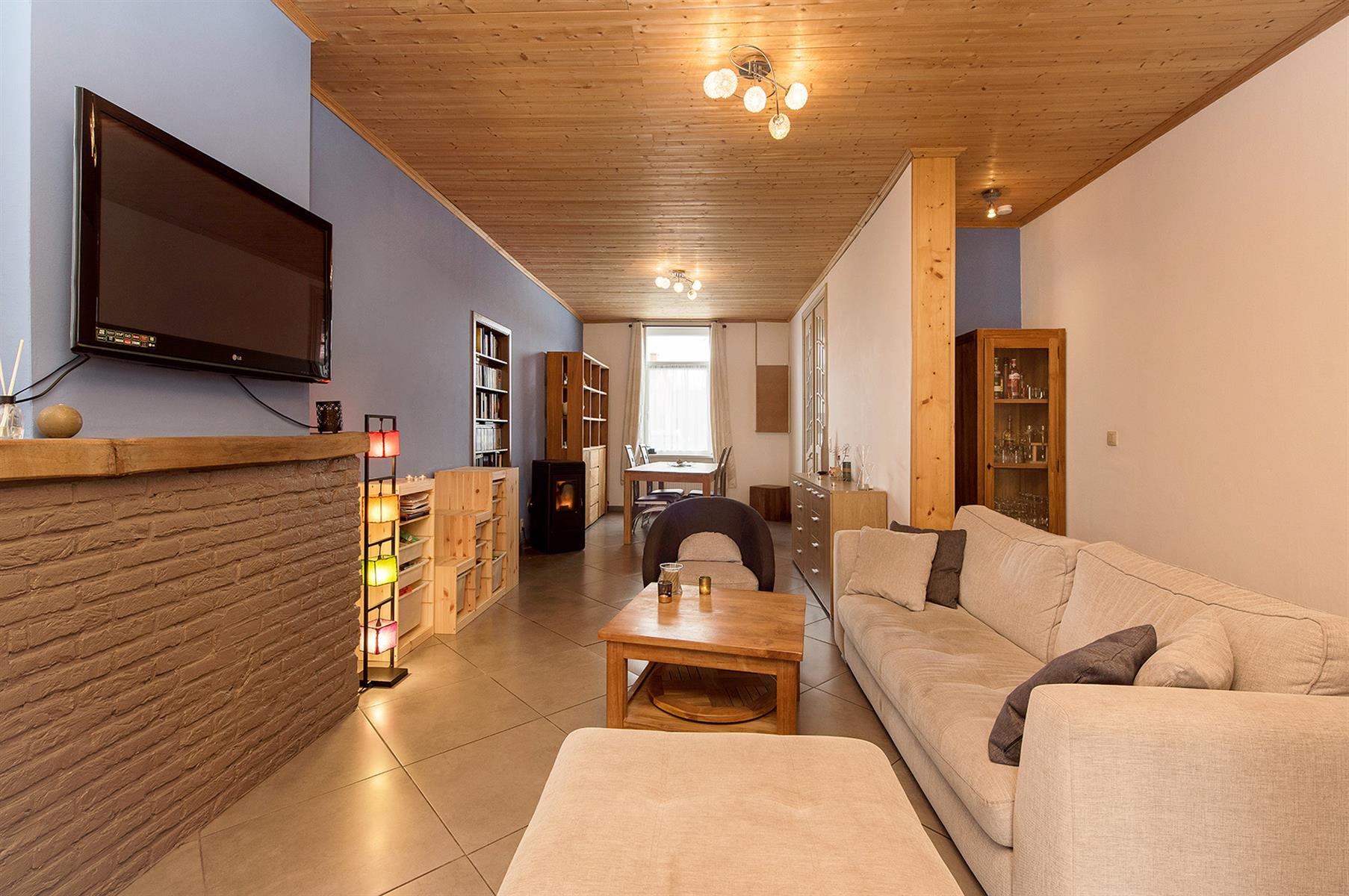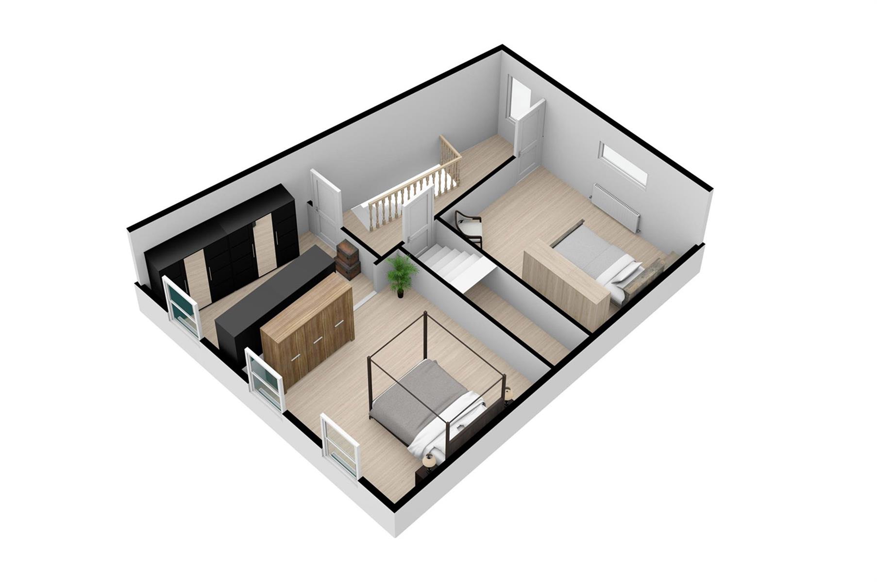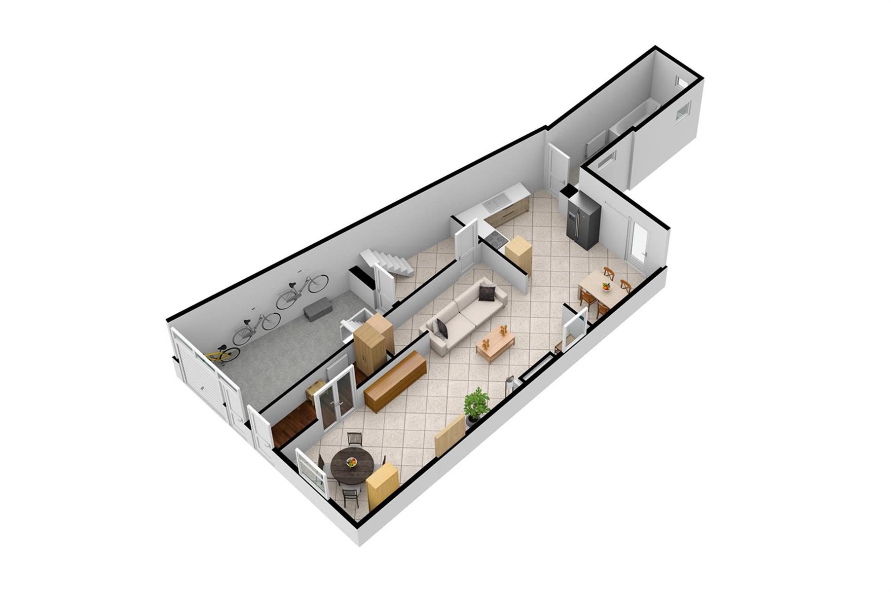 – Rez : hall d’entrée, séjour, cuisine, salle de bains, hall et petit garage de +/- 13,5m².