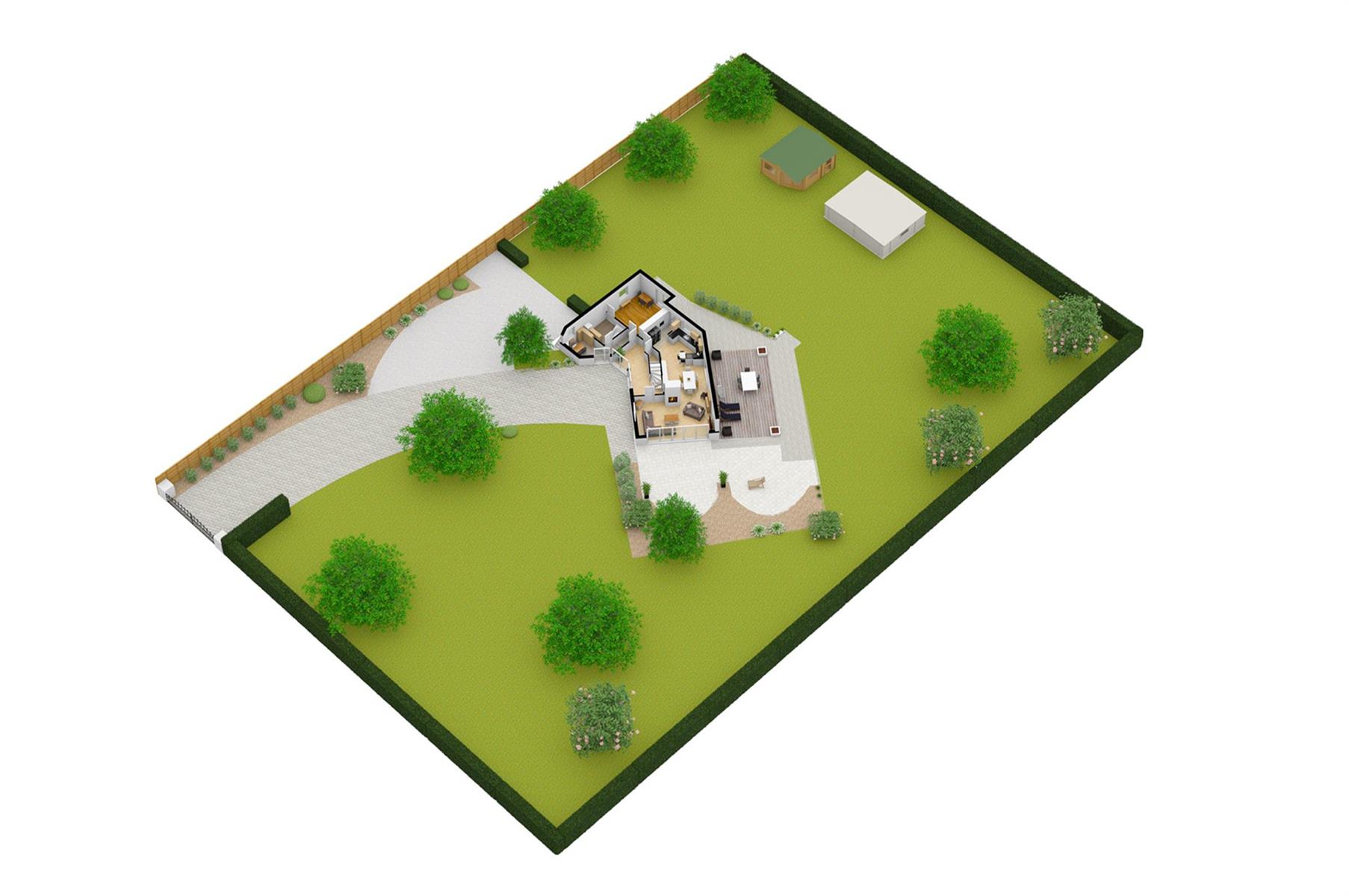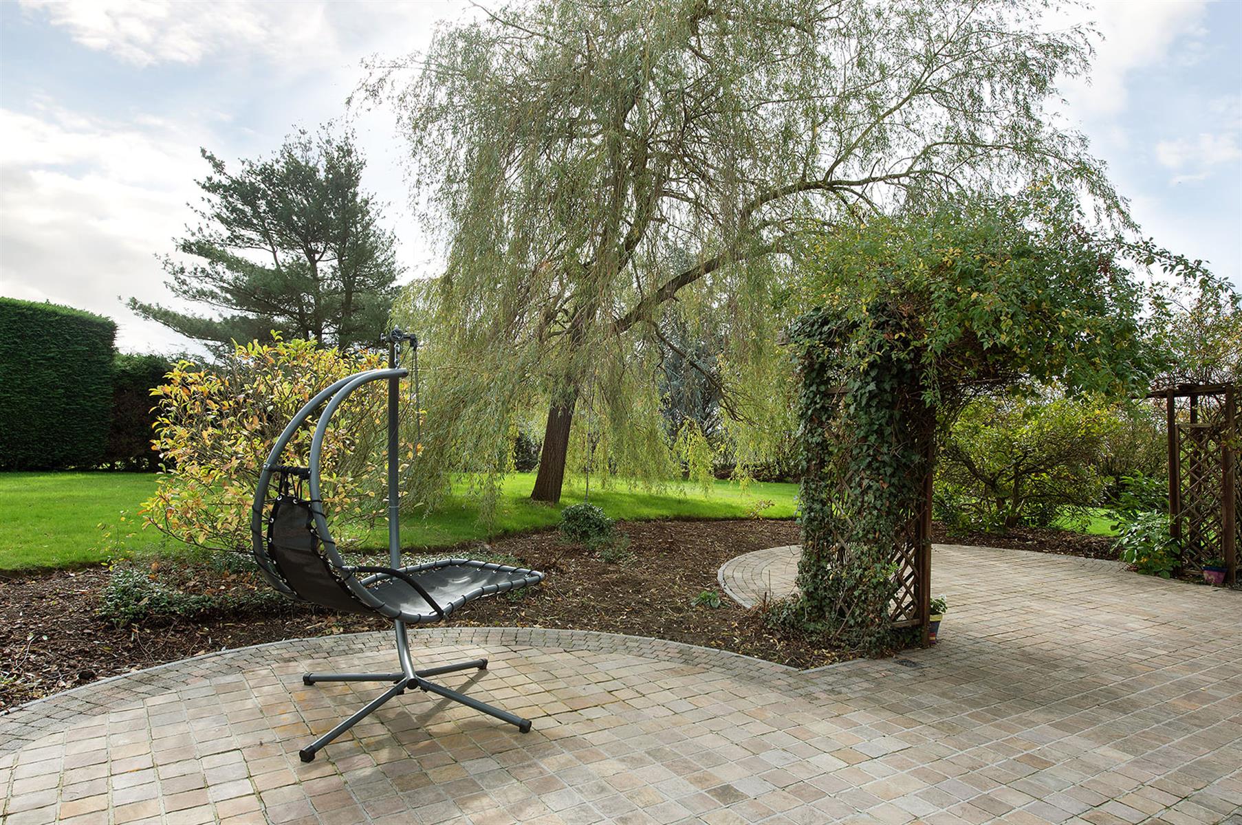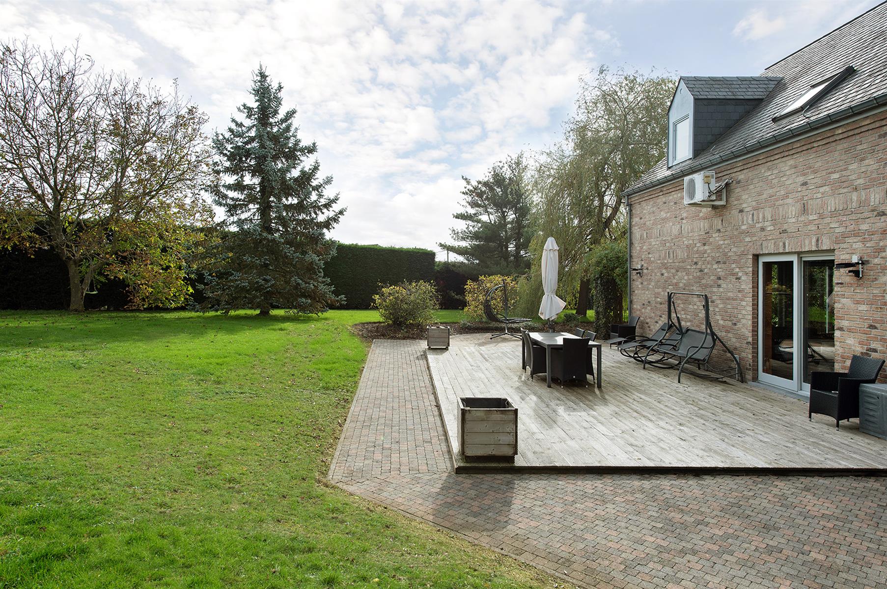 – Extérieur : grand jardin arboré avec terrasse.
