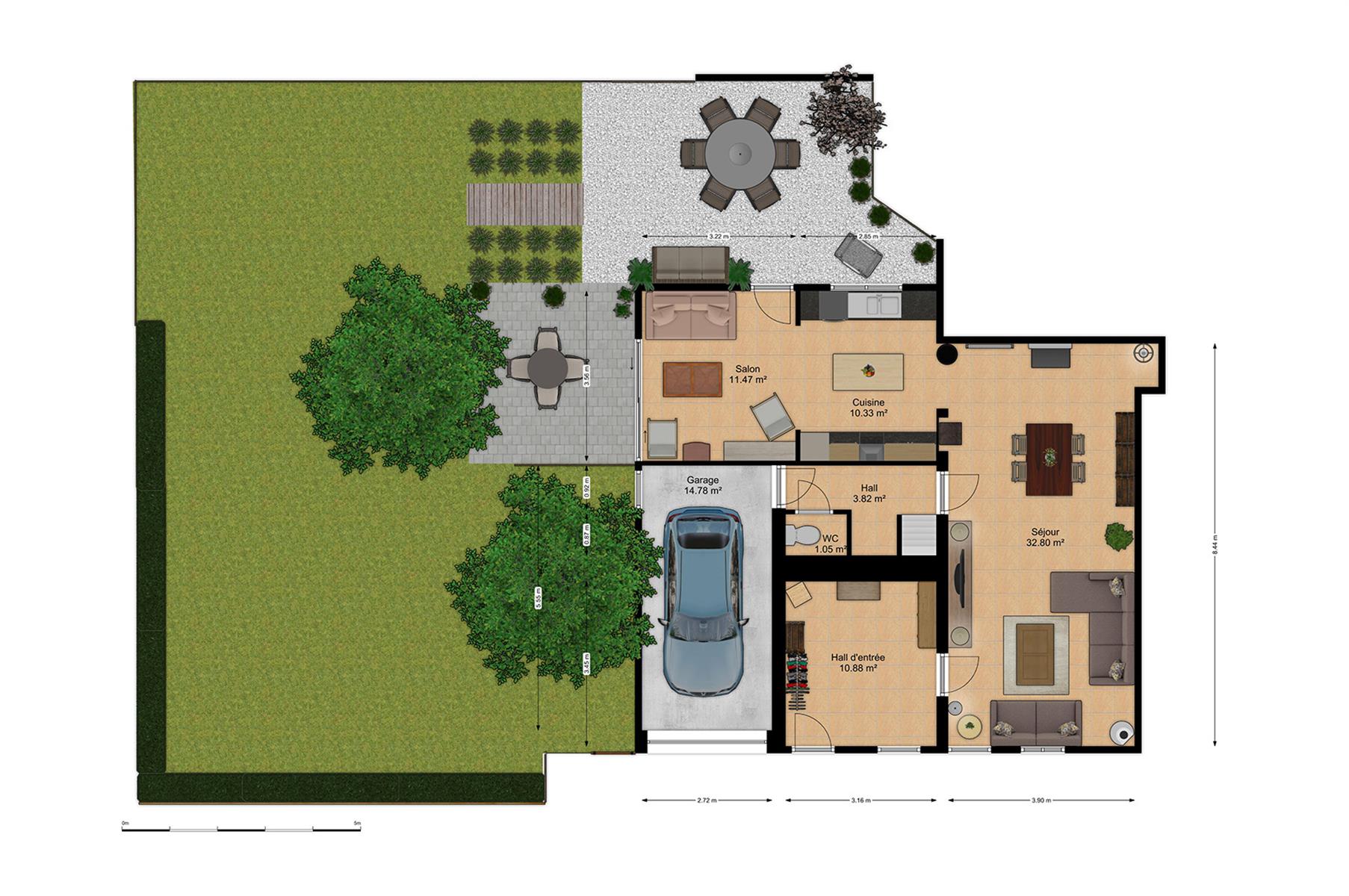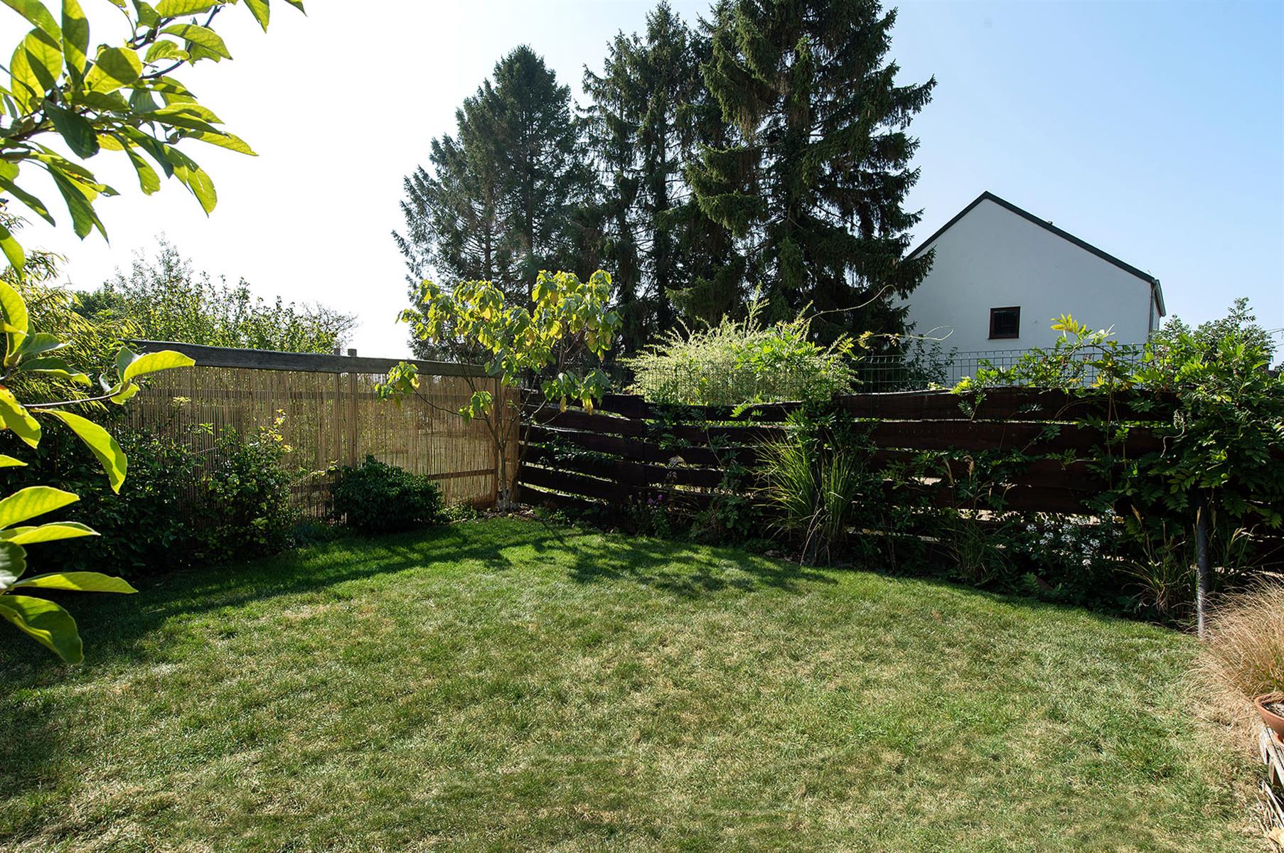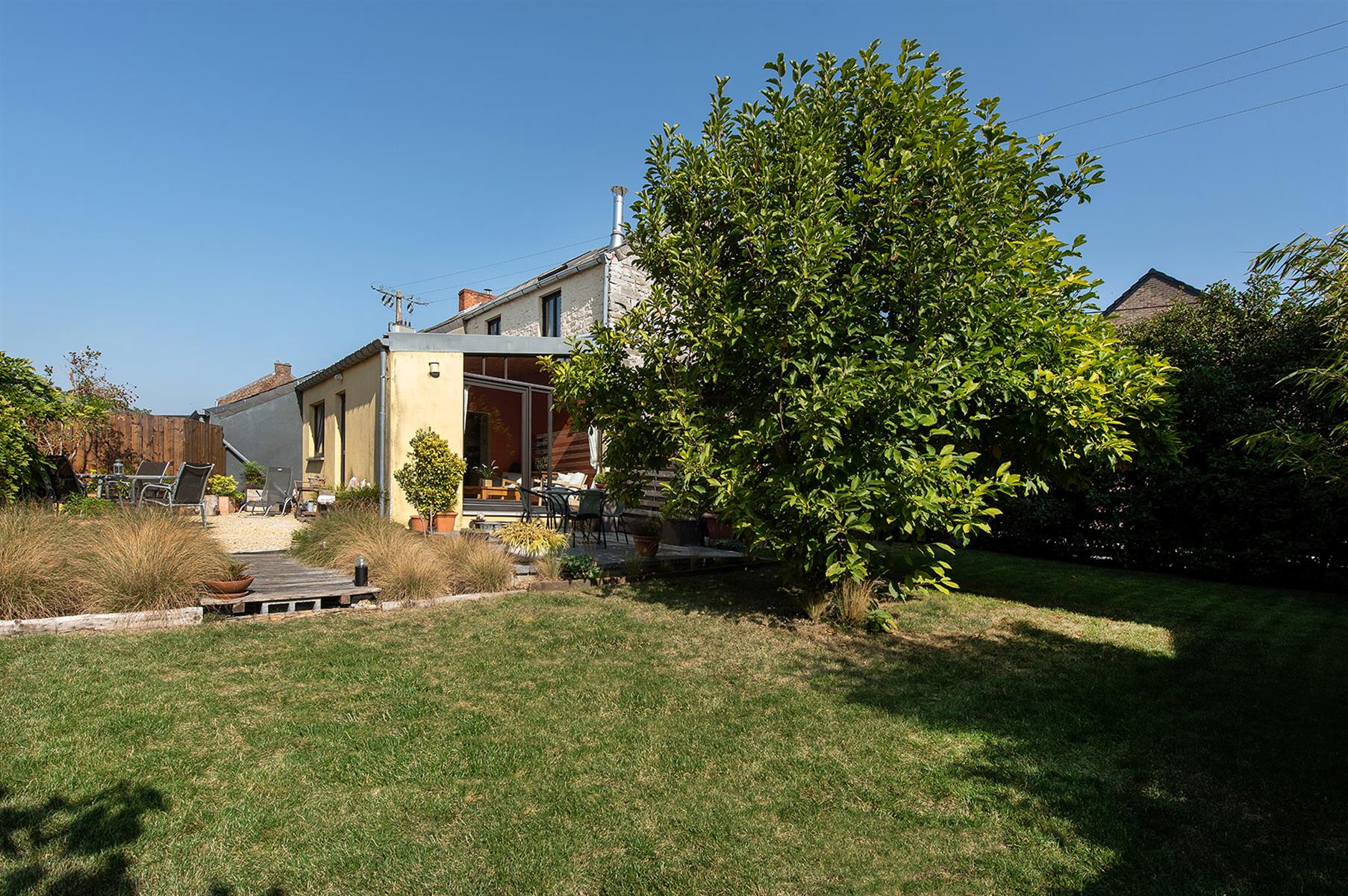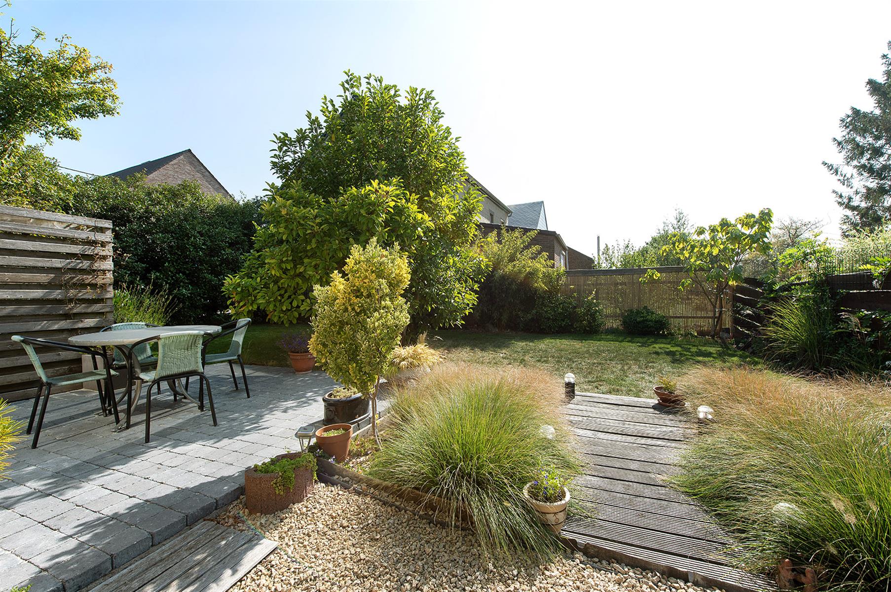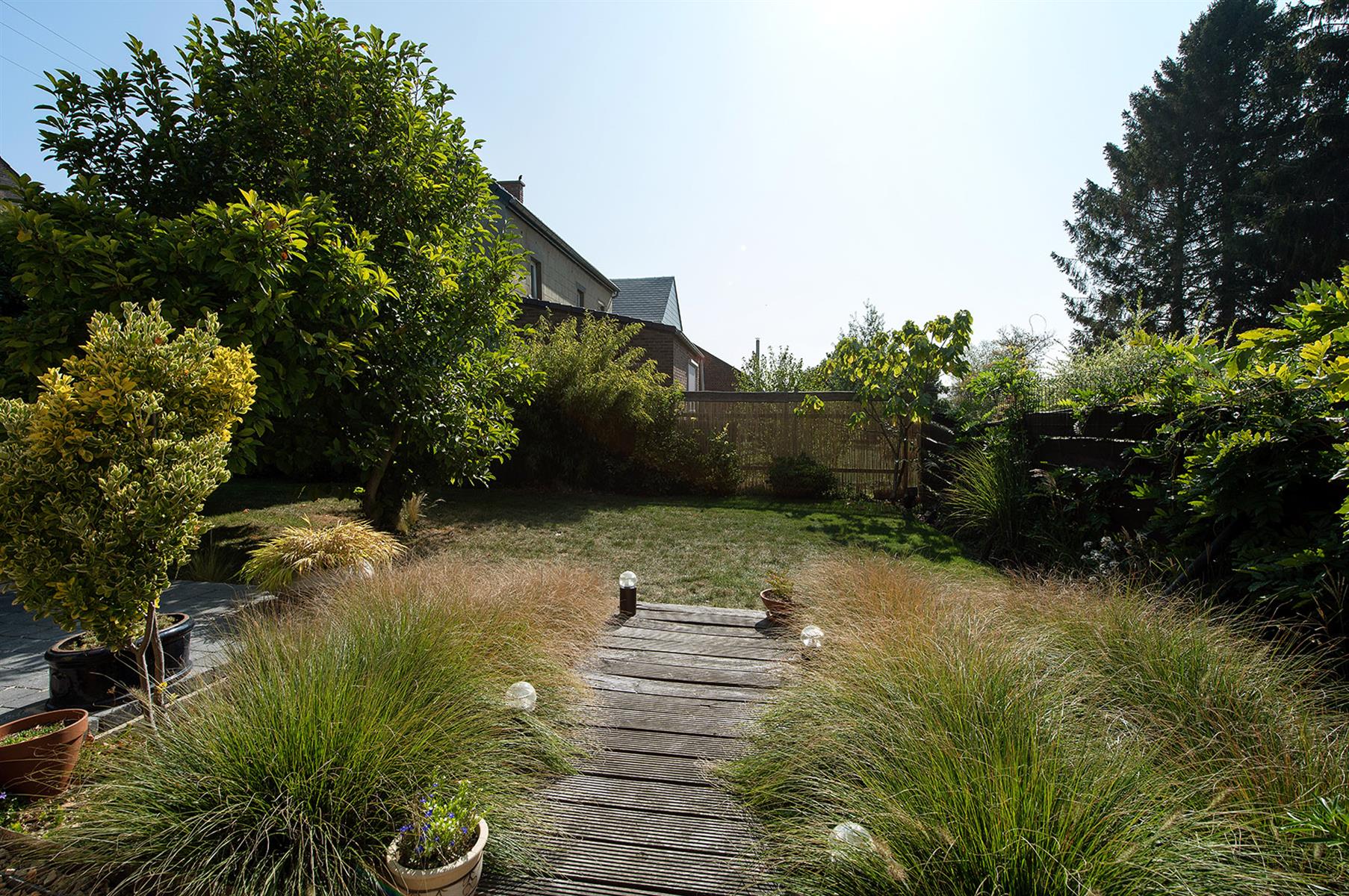 – Extérieur : Joli jardin arboré avec terrasse repris en zone bâtissable.