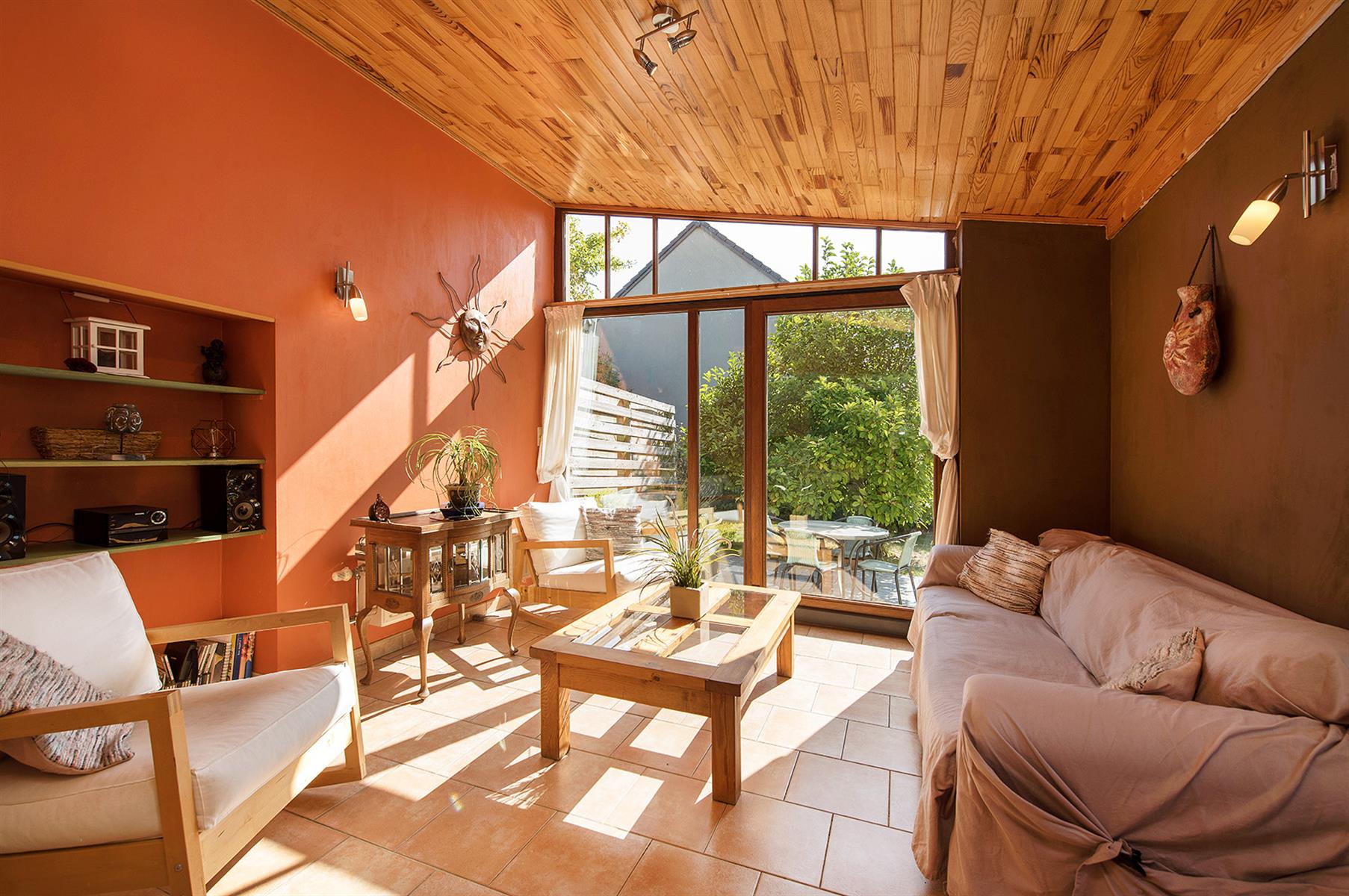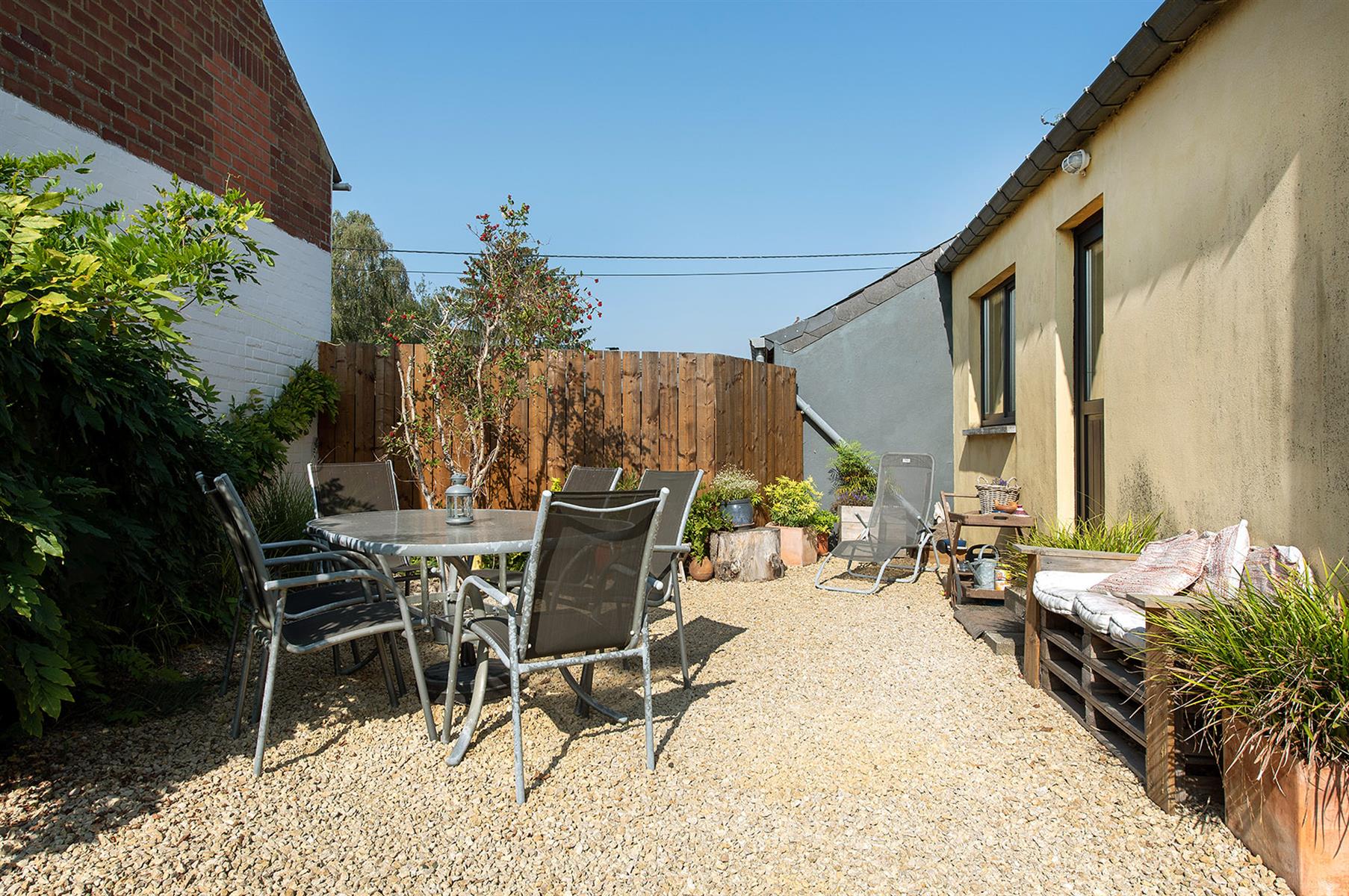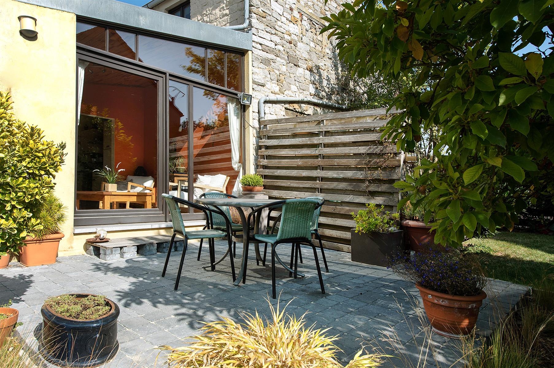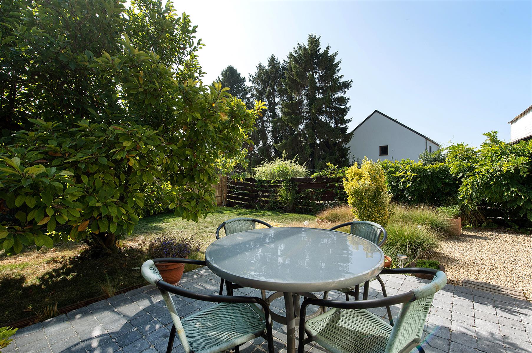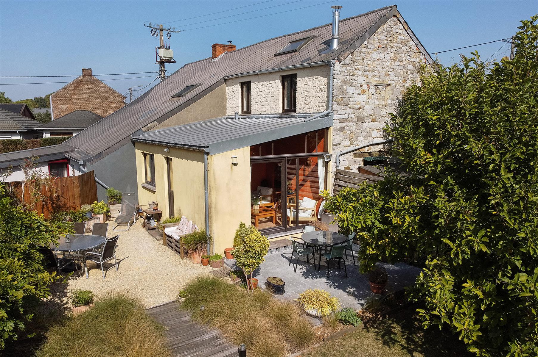 – Extérieur : Joli jardin arboré avec terrasse repris en zone bâtissable.