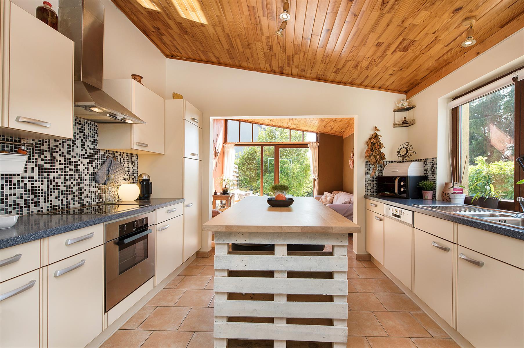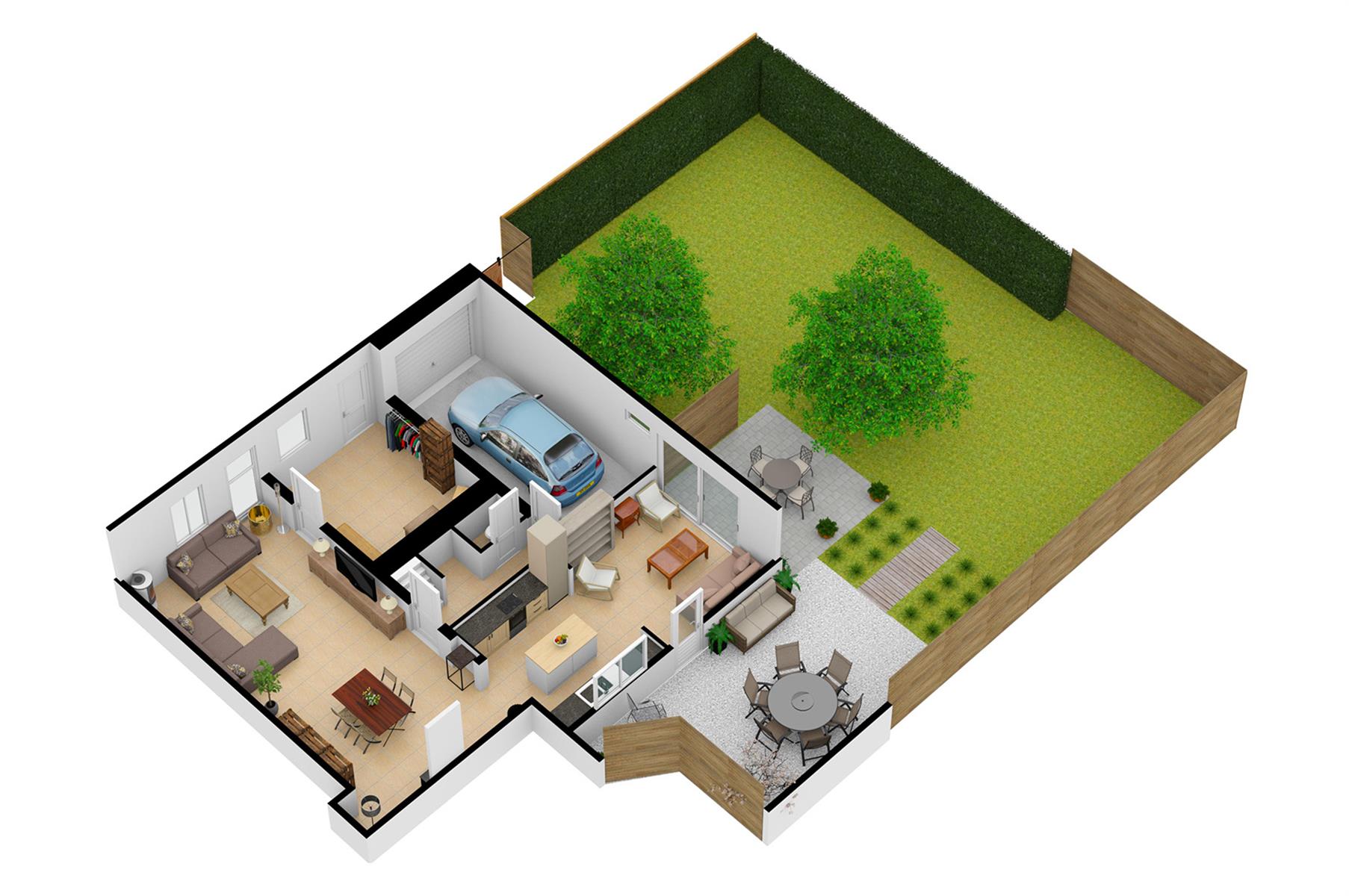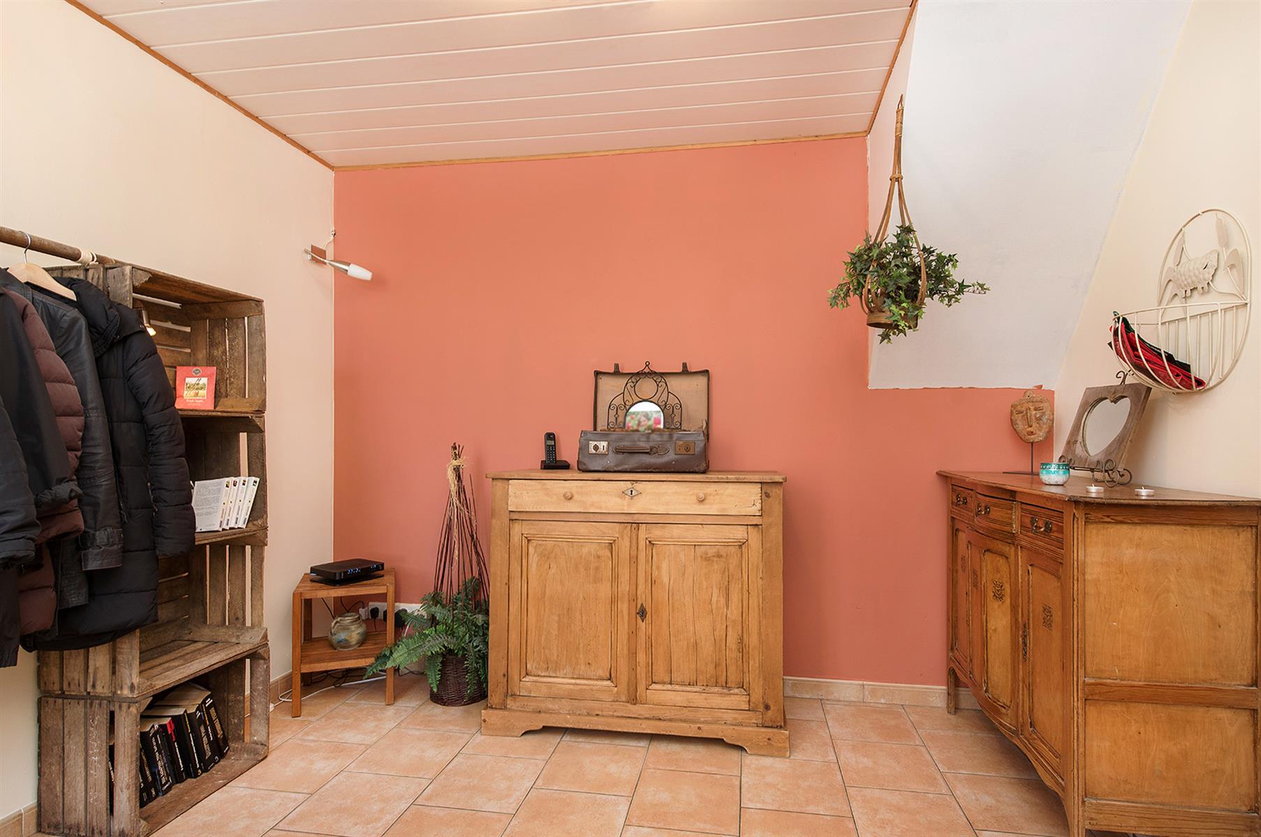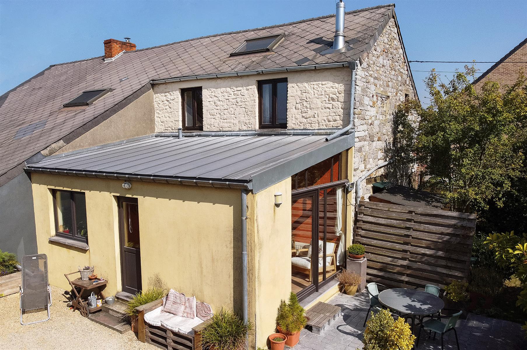 – Extérieur : Joli jardin arboré avec terrasse repris en zone bâtissable.
