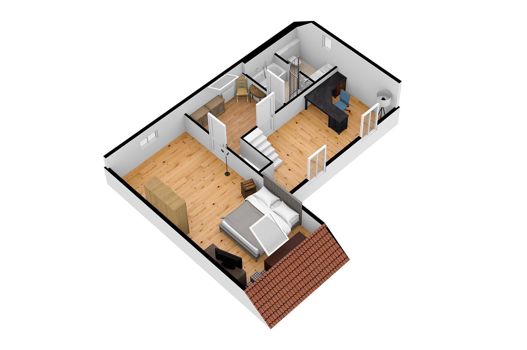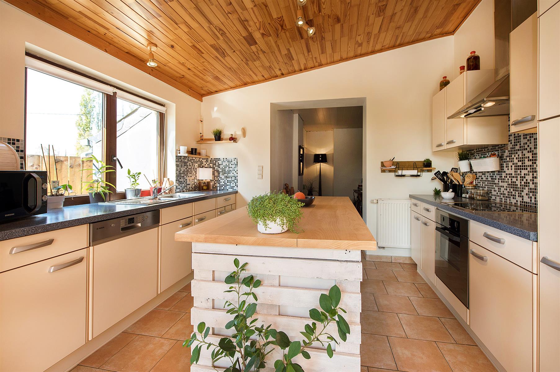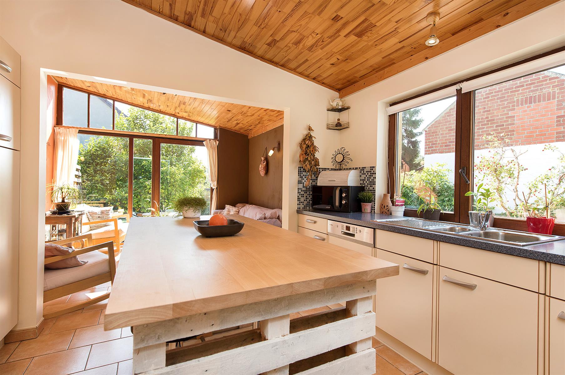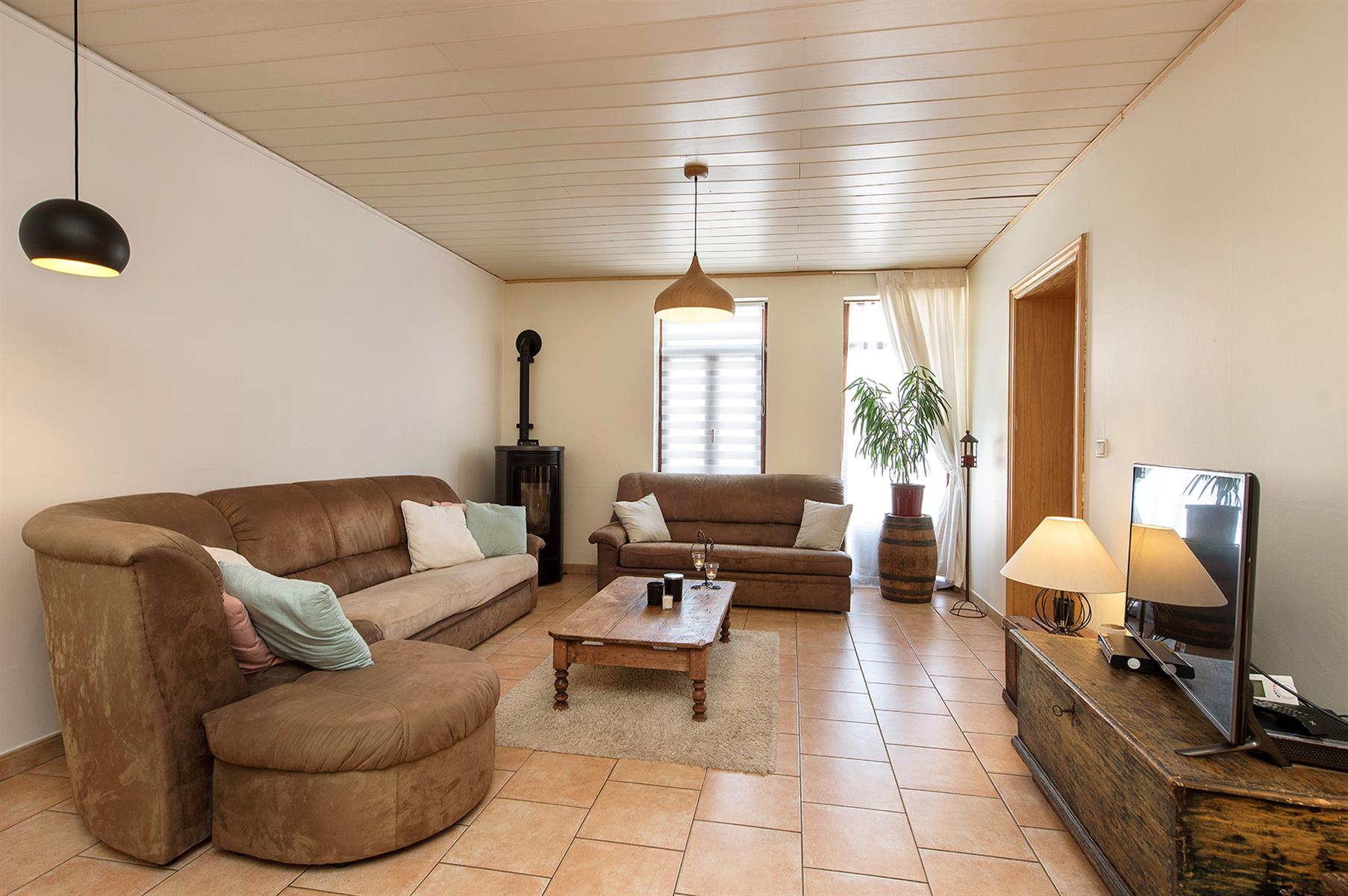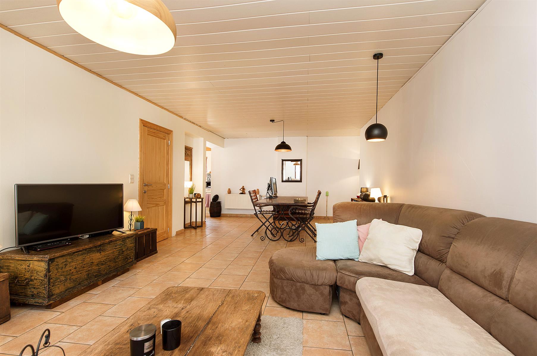 – Extérieur : Joli jardin arboré avec terrasse repris en zone bâtissable.