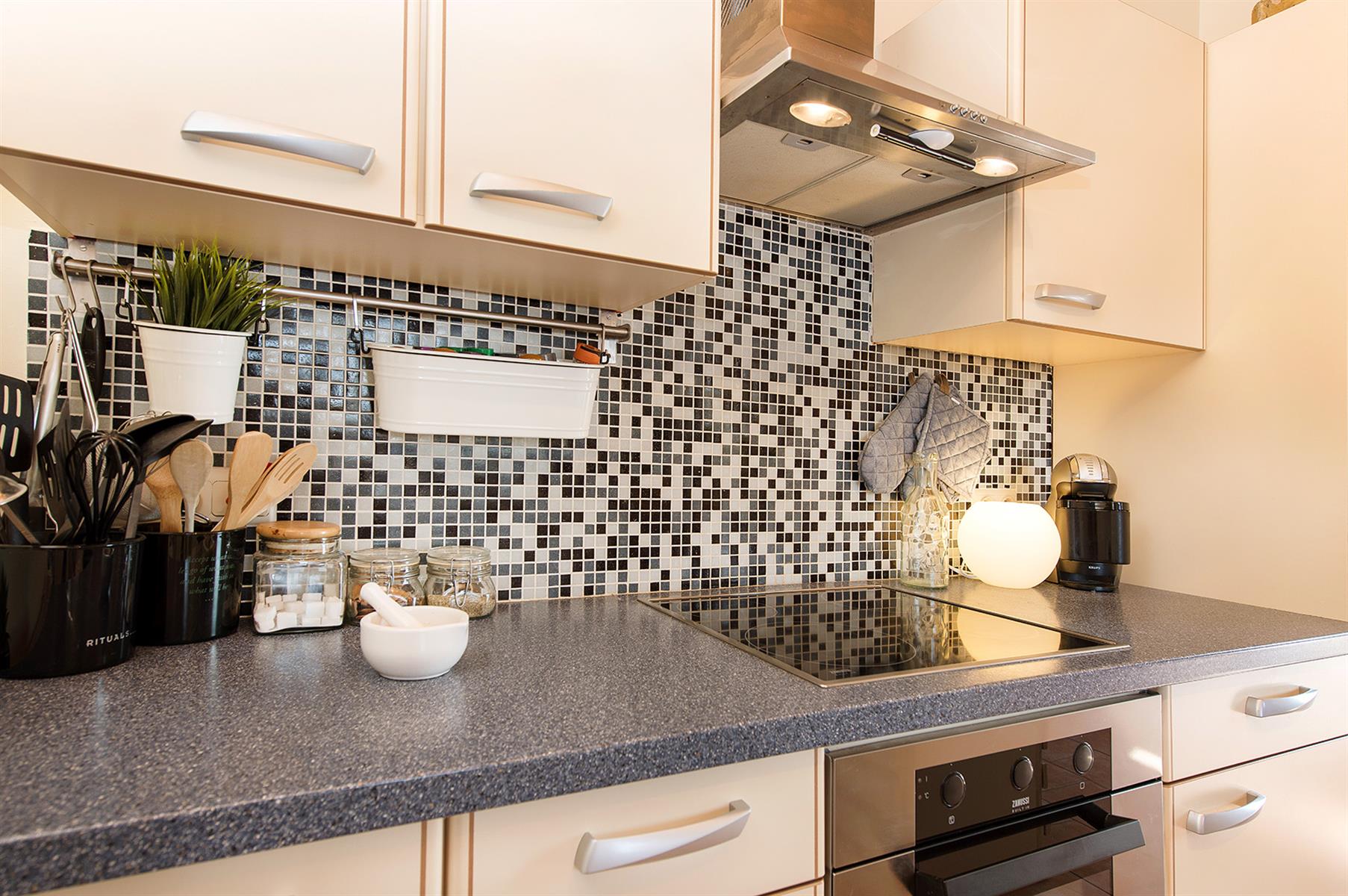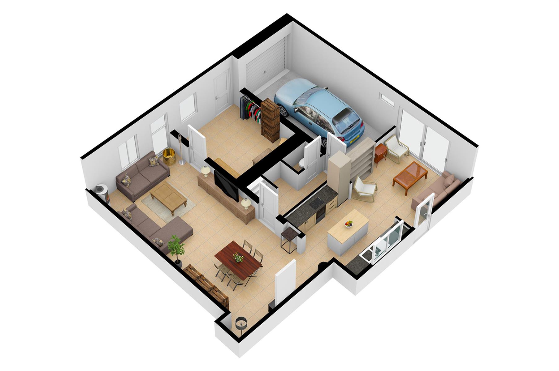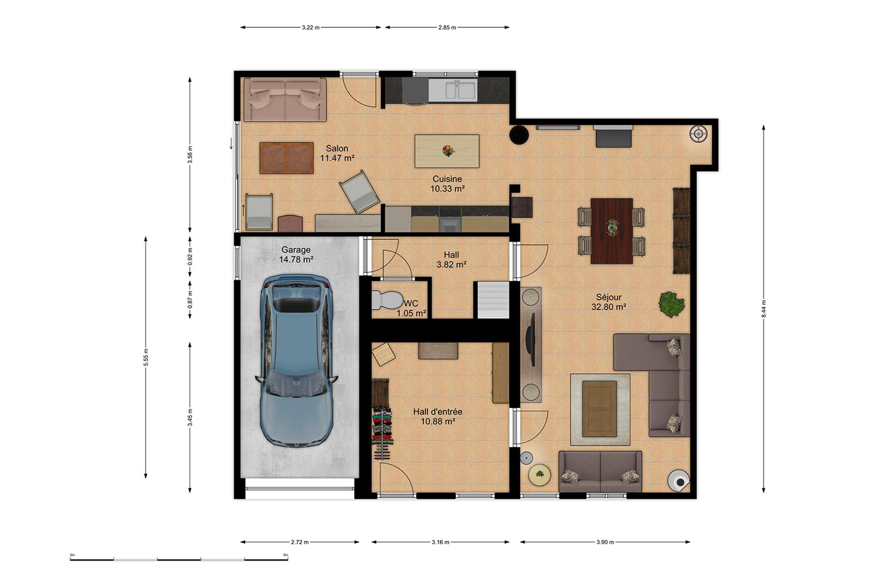 – Rez : hall d’entrée, spacieux séjour, salon cosy, cuisine équipée, wc séparé et garage 1 véhicule.