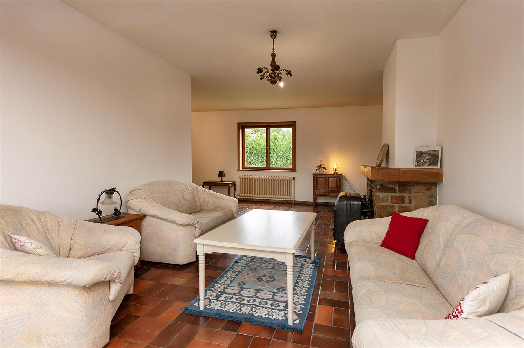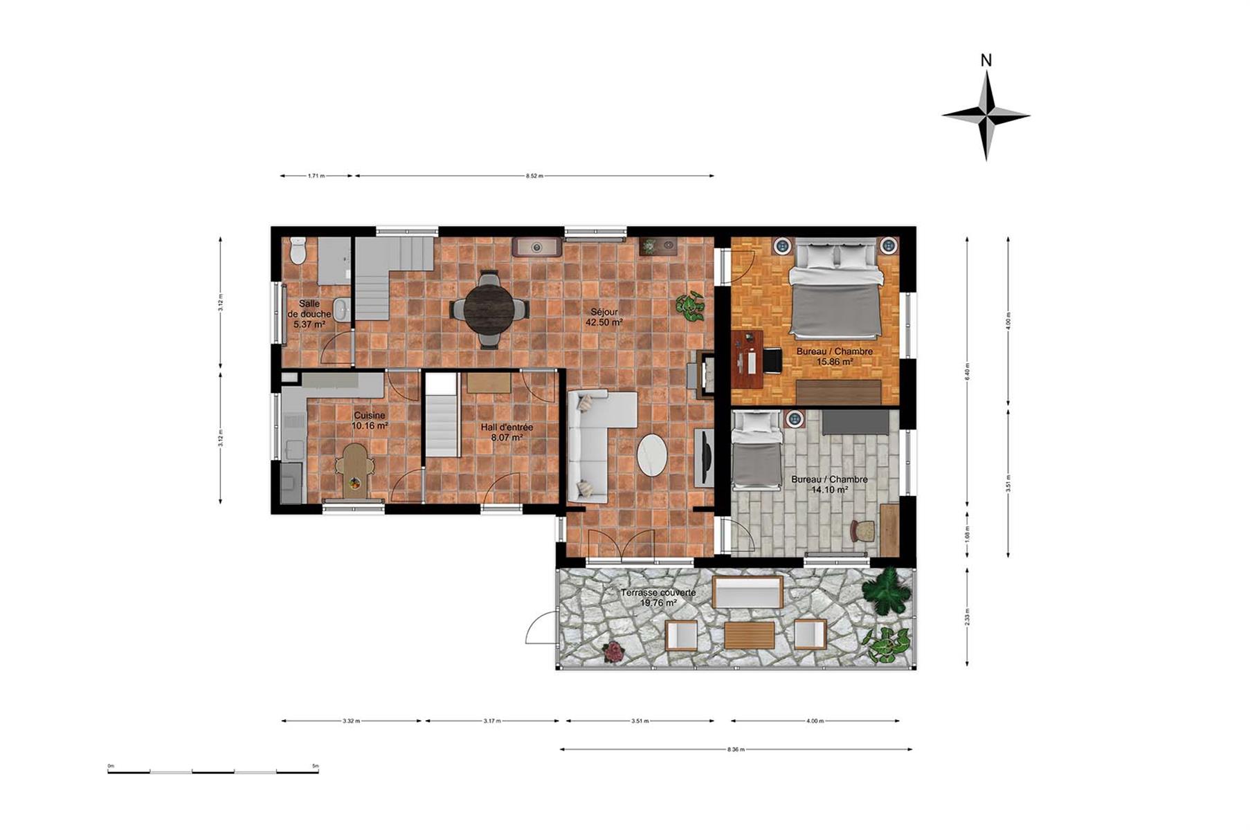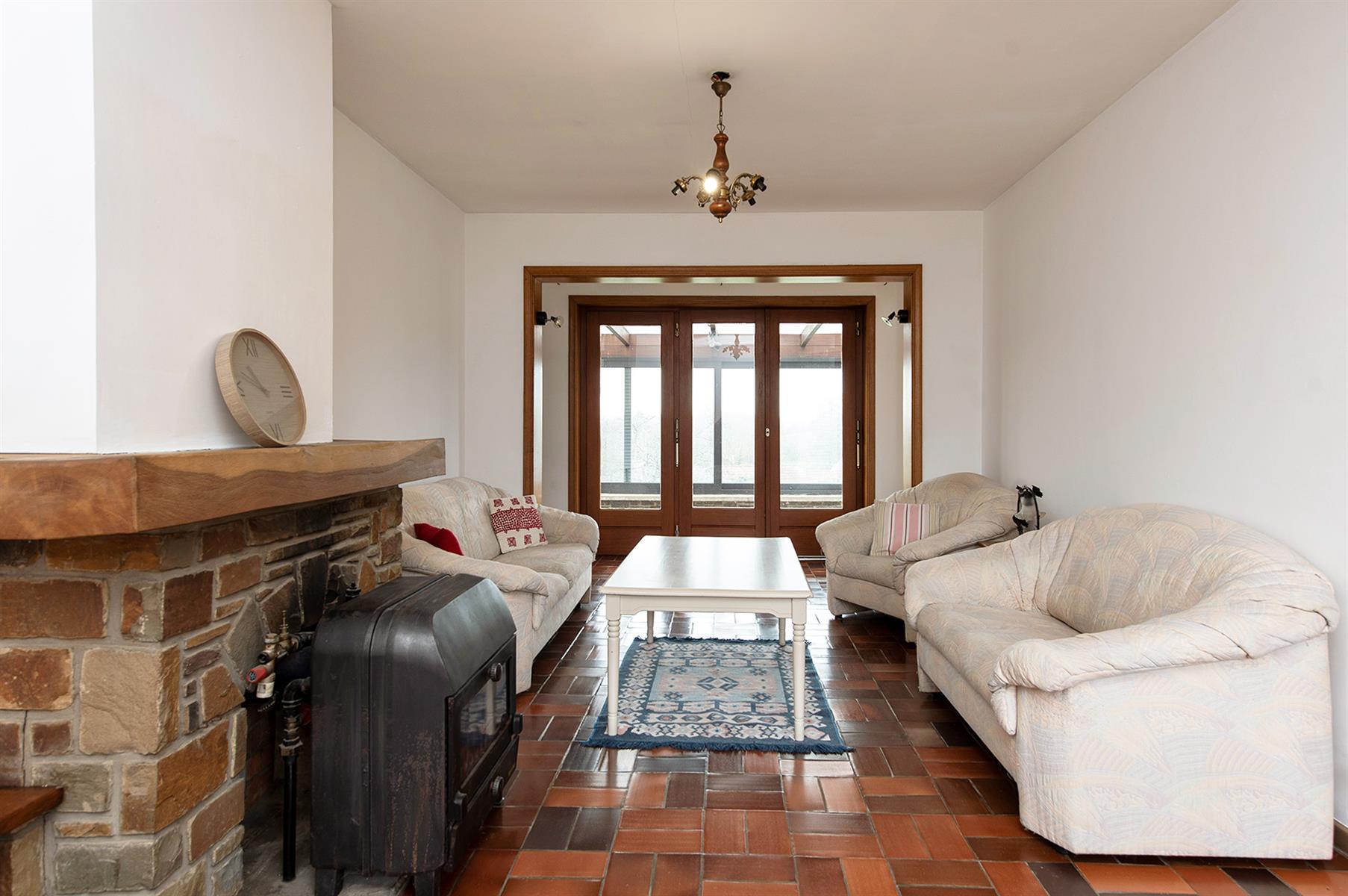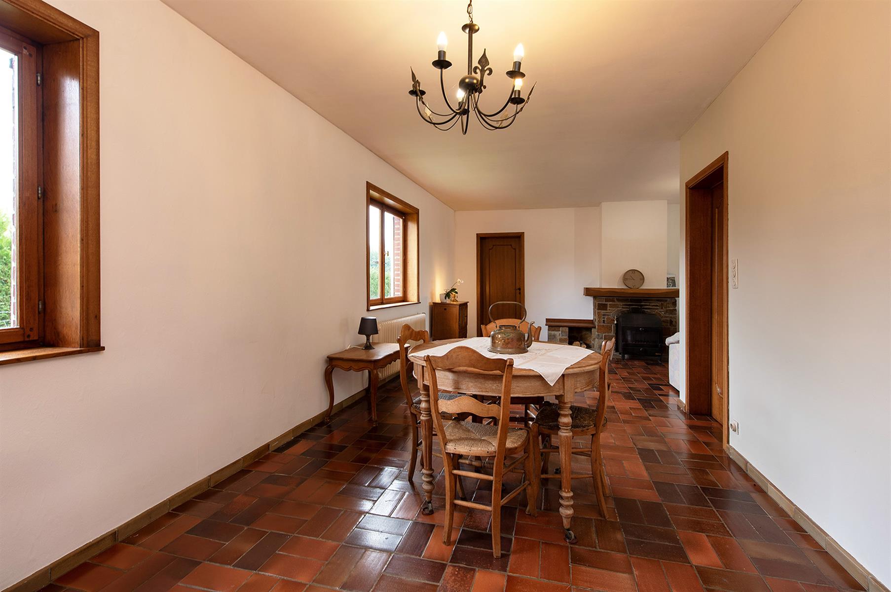 – Rez : hall d’entrée, vaste séjour agrémenté d’un poêle au bois, cuisine, terrasse couverte, salle de bains et 2 bureaux pouvant servir de chambres.
