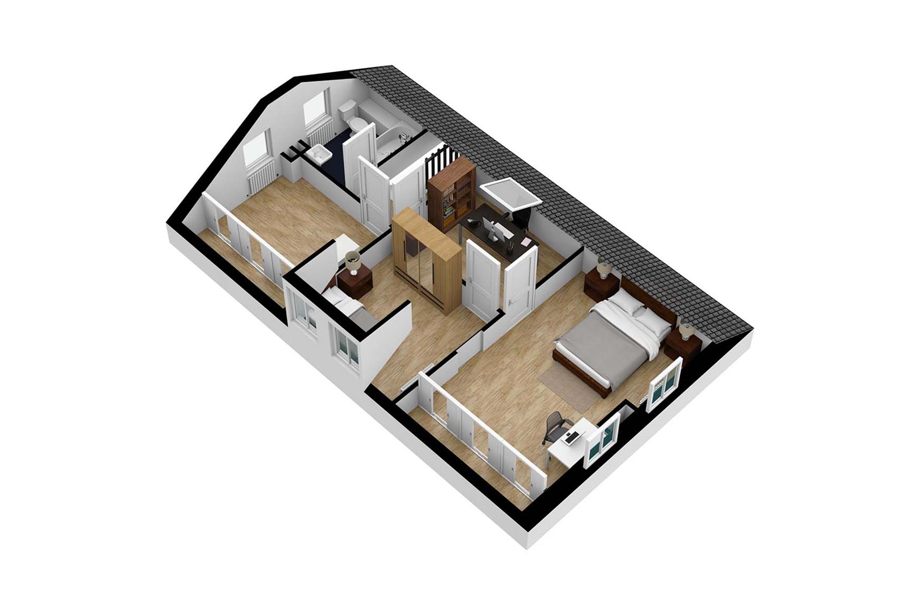 – Etage : hall de nuit desservant 2 chambres, salle de bains et 2 bureaux dont un qui sert de dressing.